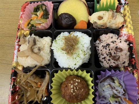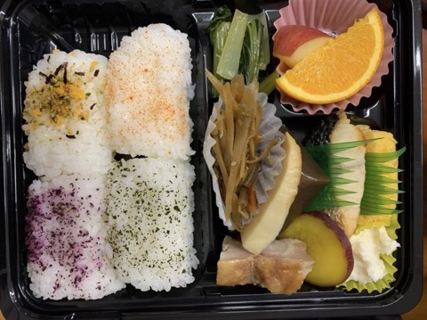 ふりかけのかかったおにぎり4種類と、栄養のバランスを考えられたおかず。