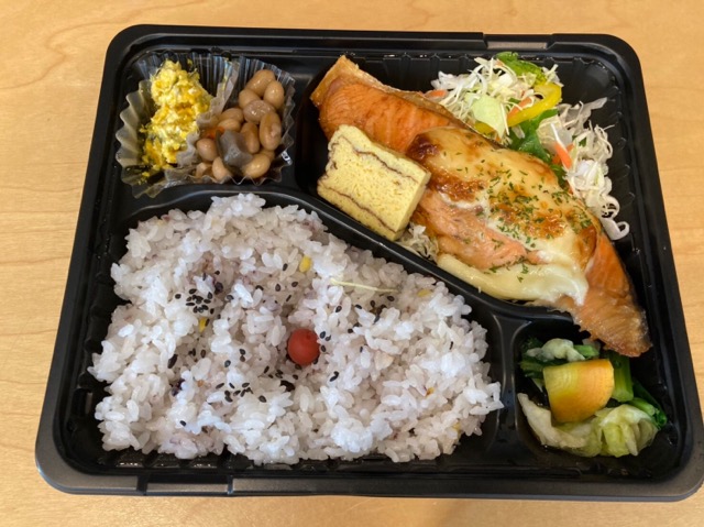 鮭のチーズマヨ焼き、しいたけの肉詰め、大根、卵焼き、サラダ、カボチャのサラダ、ひじき