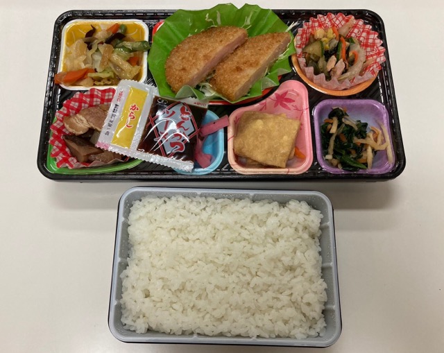 メインはハムカツで、野菜炒めやおひたしなどの副菜も豊富。しかしあったかくない。