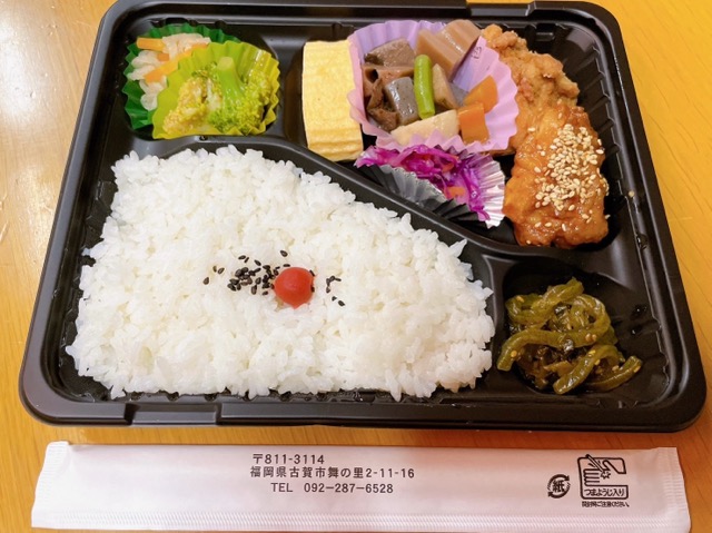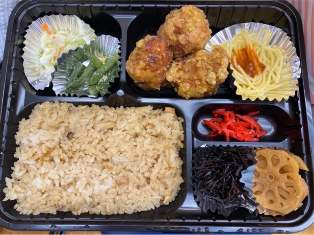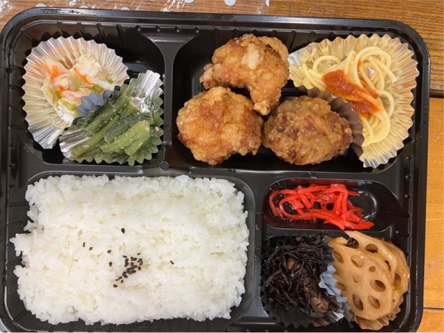昼得弁当は、唐揚げ2種と煮物などが入ったお弁当。甘辛の唐揚げ美味しい。