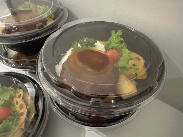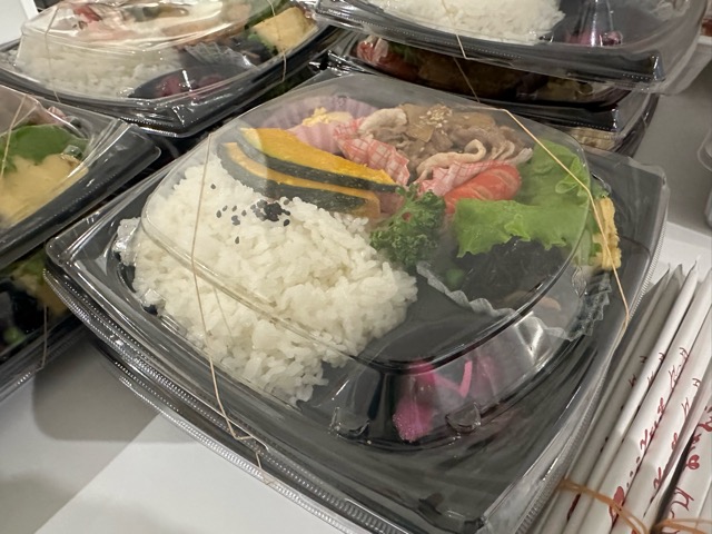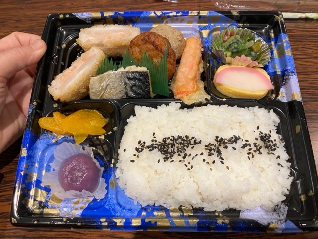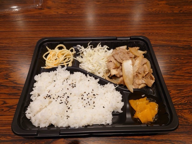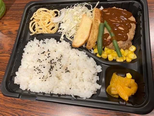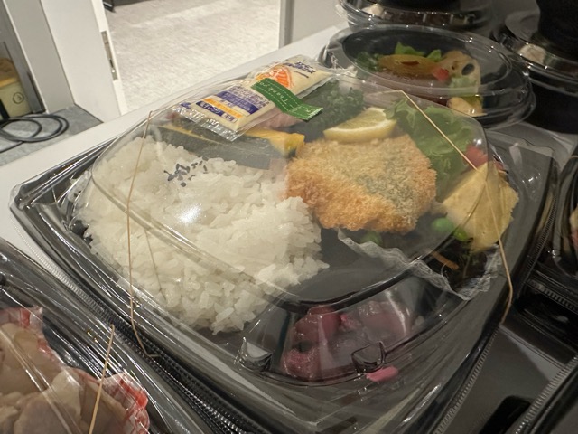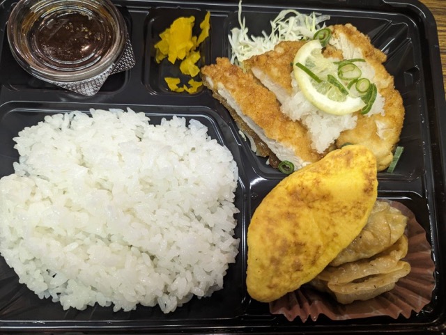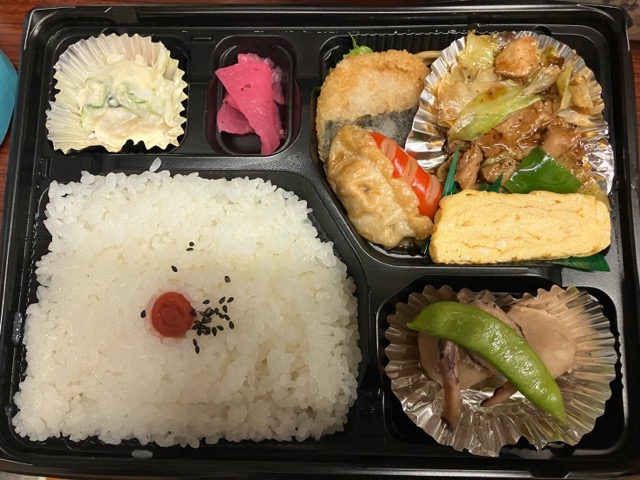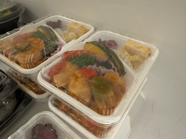 おかずの下にはナポリタン風パスタが敷いてあったりと、おかずの品数は多い。