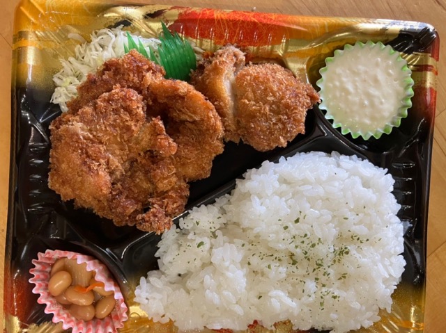 コロッケ、竜田揚げ、かき揚げ、ナスの天ぷらと揚げ物がたくさん入っているが、薄味であっさりしている。