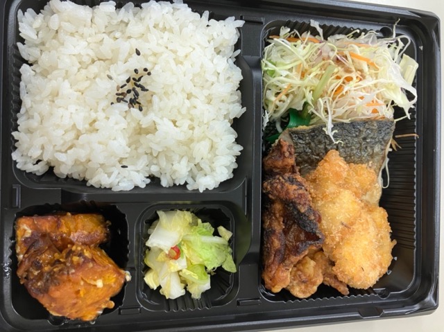 魚(サバ?)、唐揚げ、カボチャ。カボチャは軽く素揚げ?している。味付けもちょうど良く美味しい。唐揚げも肉がジューシーで美味しかった。