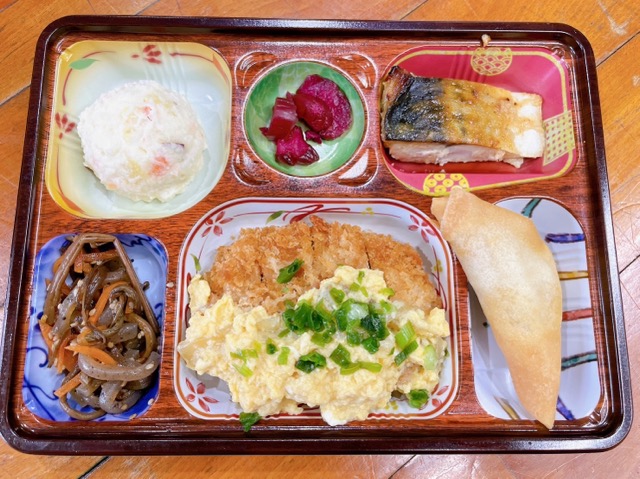 カツ玉子とじ、鯖の西京焼き、さつま芋サラダ、ぜんまい煮でした。写真のおかずセットの他にご飯がパックでついています。