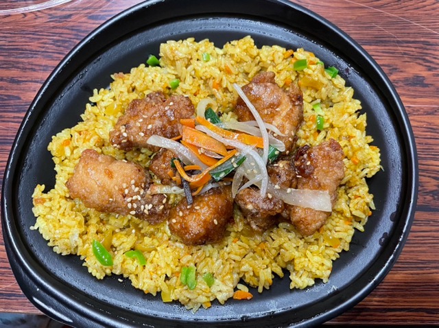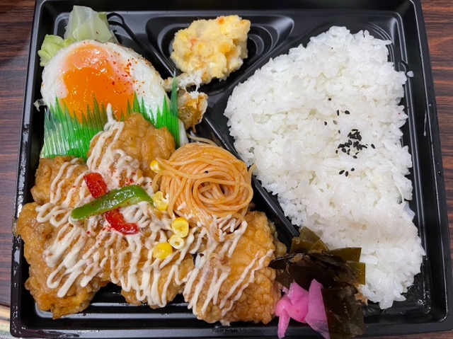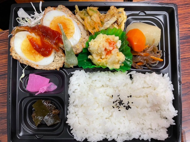 ドライカレーの上に乗っているのは唐揚げ。スコッチエッグはお弁当メニューとしては珍しいかなと思って頼んでしまいました。