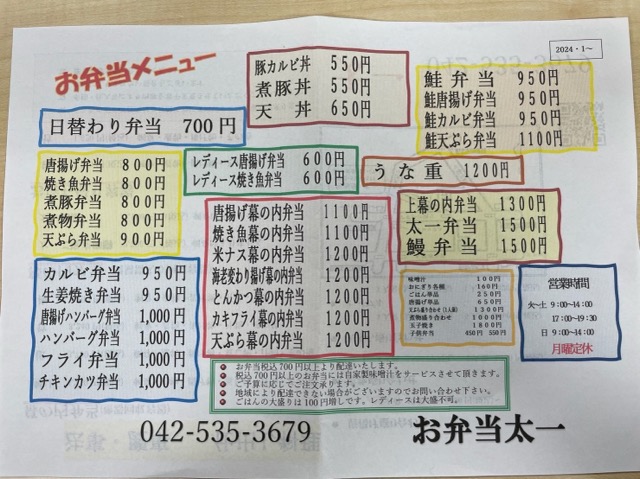 メニューはたくさんあったが。電話で注文するときに、「一人700(税込み)でおまかせしてもいいですか?」と聞いてみたら、「あっさり」と「しっかり」の2種類用意してくれた。