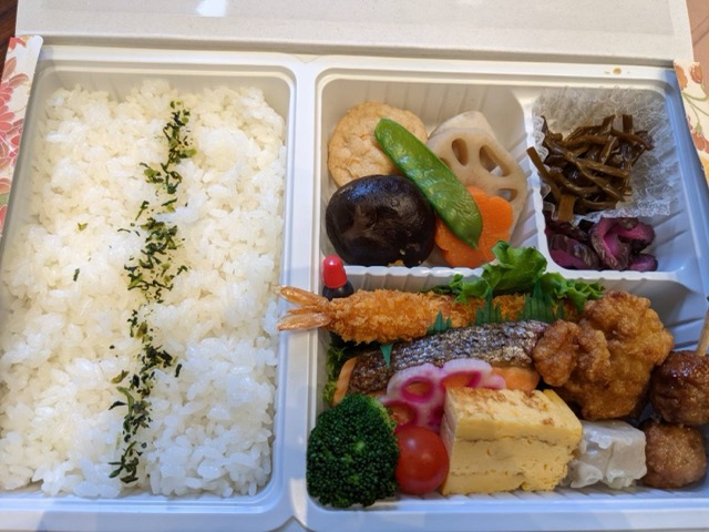 鮭の塩焼き、から揚げ、肉団子、海老フライ、酢れんこん、たまご焼き、ブロッコリー、ミニトマト、お煮しめ、すぐき。ご飯とお新香。