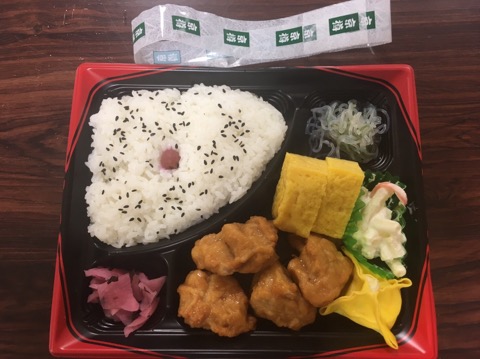 ハンバーグはレトルトっぽい感じでいまいち。唐揚げは普通に美味しい。